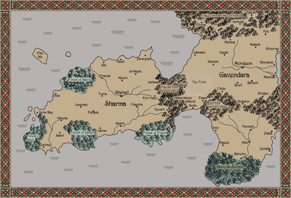 I like the map of Sharma and Gavendara (I’m a sucker for fantasy cartography). Did that come early in the process of writing, helping you visualise etc?