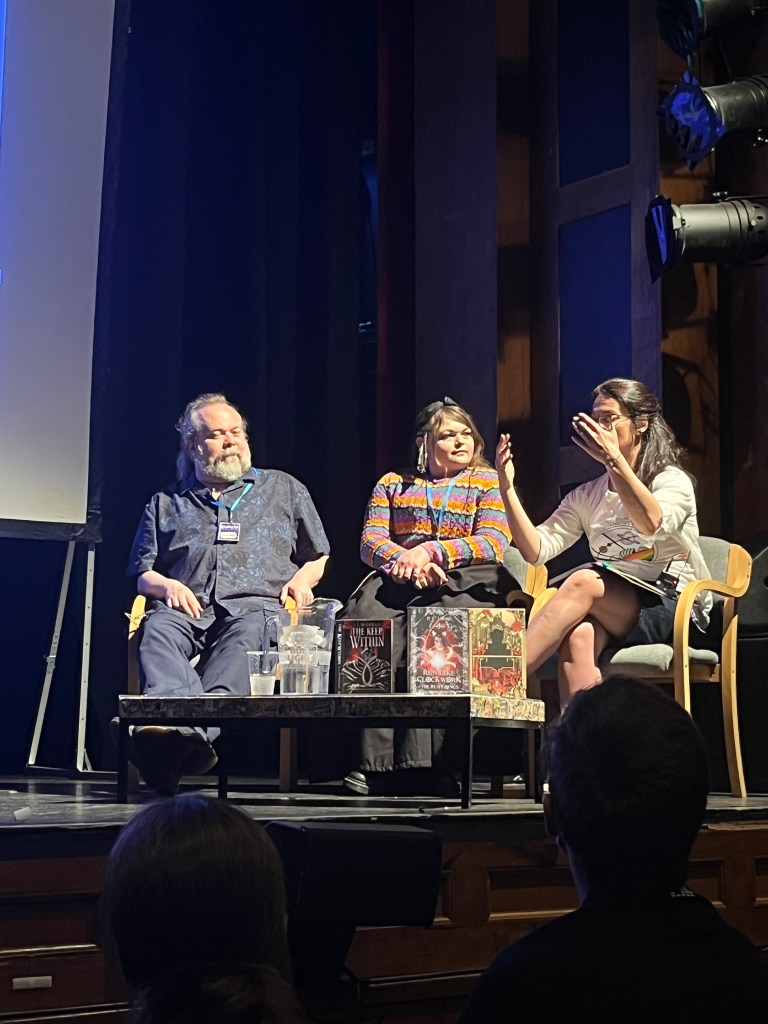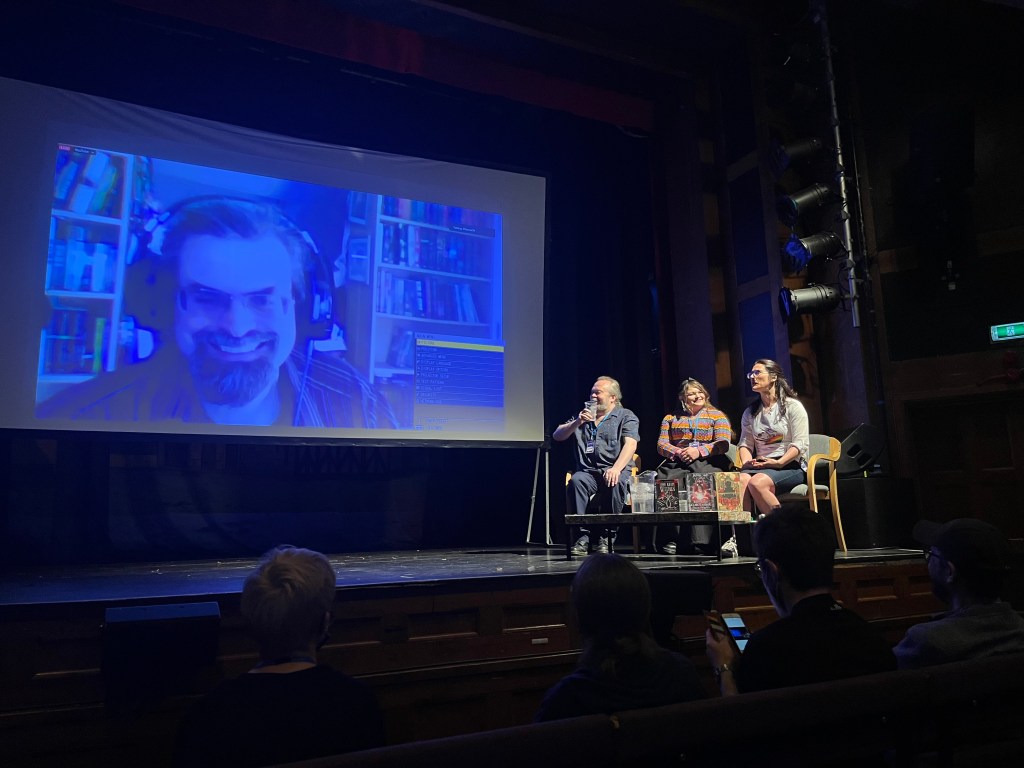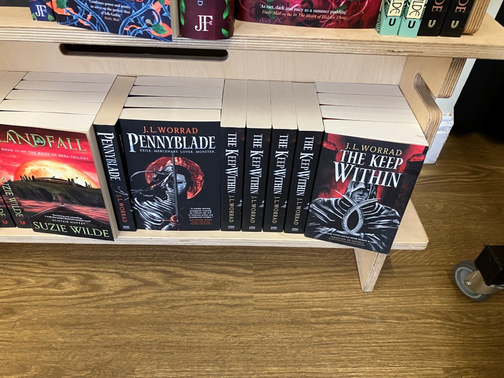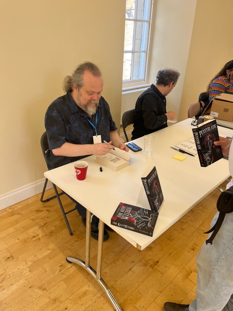 So I was invited to speak and sign books at Cymera festival in Edinburgh. I had a lovely time meeting readers and chatting with pals old and new. Whole lotta fun talking about cities in fantasy fiction with authors E.C. Hibbs and Adrian Tchaikovsky (who had to Zoom due to COVID). Closer shot. The moderator was Meg MacDonald who is awesome at this interviewing thing.I’ve never seen that much Worrad, not outside of my bathroom mirror at least. That’s like a whole half shelf!
